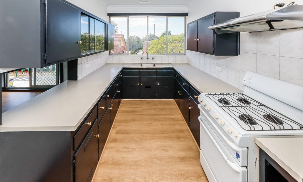 Separate kitchen with gas cooking and plenty of cupboard space